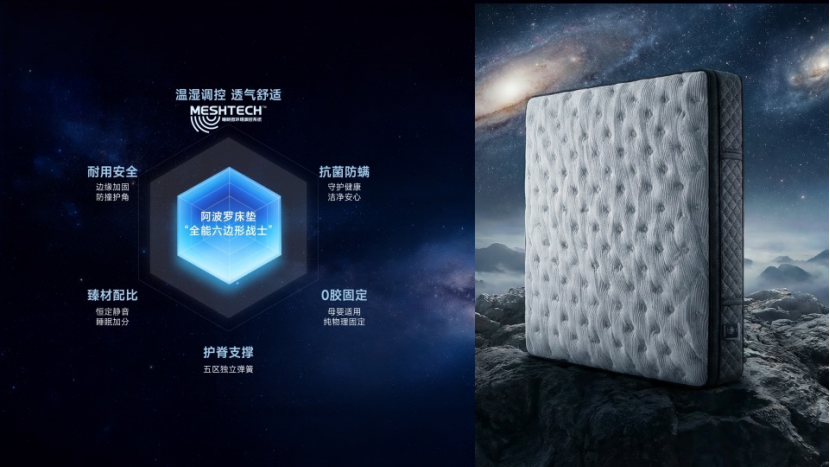 此次发布中,爱依瑞斯重点介绍的 MESHTECH睡眠微环境调控系统,正是率先应用于新品阿波罗床垫中的核心技术。相较于传统床垫更多停留在软硬度和支撑感层面的改善,MESHTECH更聚焦用户在真实睡眠中普遍面临的微环境困扰,例如刚躺下时迟迟难以放松、夜间闷热出汗、湿气滞留带来的黏腻不适,以及因温湿波动引发的频繁翻身、浅睡和睡眠中断。